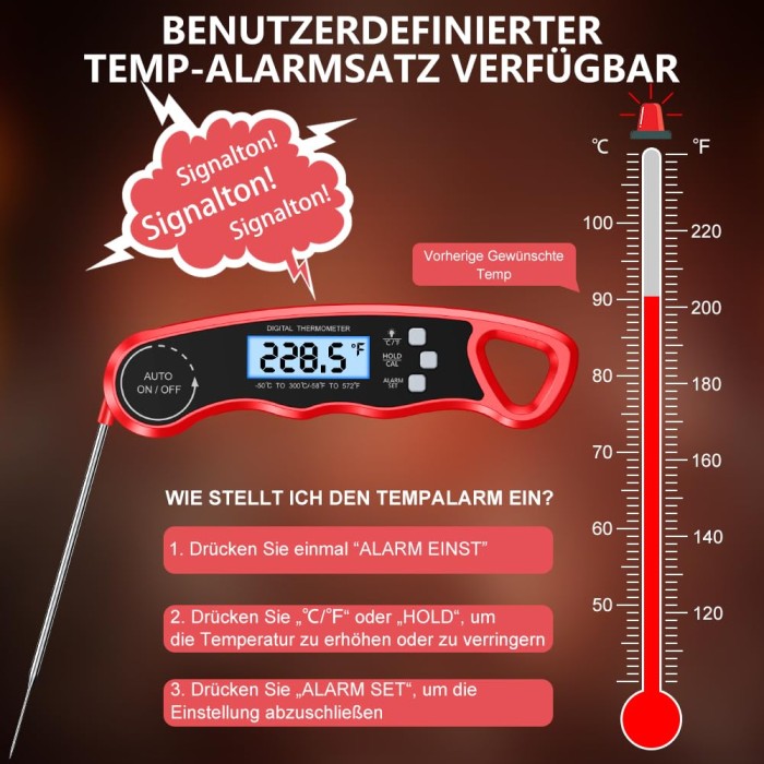 - [Praktische Temperaturalarmfunktion] Drücken Sie die Taste "ALARM SET" auf dem Kochthermometer, um die Zieltemperatur einzustellen. Das sofort ablesbare Speisenthermometer gibt einen Signalton ab und blinkt auf dem Bildschirm, um Sie daran zu erinnern, wenn die Speisentemperatur den eingestellten Wert erreicht.