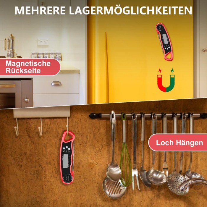 - [Benutzerfreundlich] Das Küchenthermometer mit faltbarer Sonde kann zur bequemeren Aufbewahrung einfach zusammengeklappt werden. Es verfügt über einen eingebauten Magneten und ein Aufhängeloch, sodass es einfach am Ofen oder Kühlschrank angebracht oder überall aufgehängt werden kann. Es verfügt über zwei interne CR 2032-Batterie und ein Fleischtemperaturdiagramm, mit dem Sie mühelos köstliche Gerichte zubereiten können.