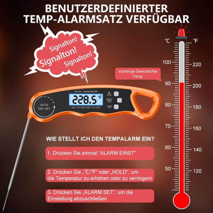 - [Praktische Temperaturalarmfunktion] Drücken Sie die Taste "ALARM SET" auf dem Kochthermometer, um die Zieltemperatur einzustellen. Das sofort ablesbare Speisenthermometer gibt einen Signalton ab und blinkt auf dem Bildschirm, um Sie daran zu erinnern, wenn die Speisentemperatur den eingestellten Wert erreicht.
