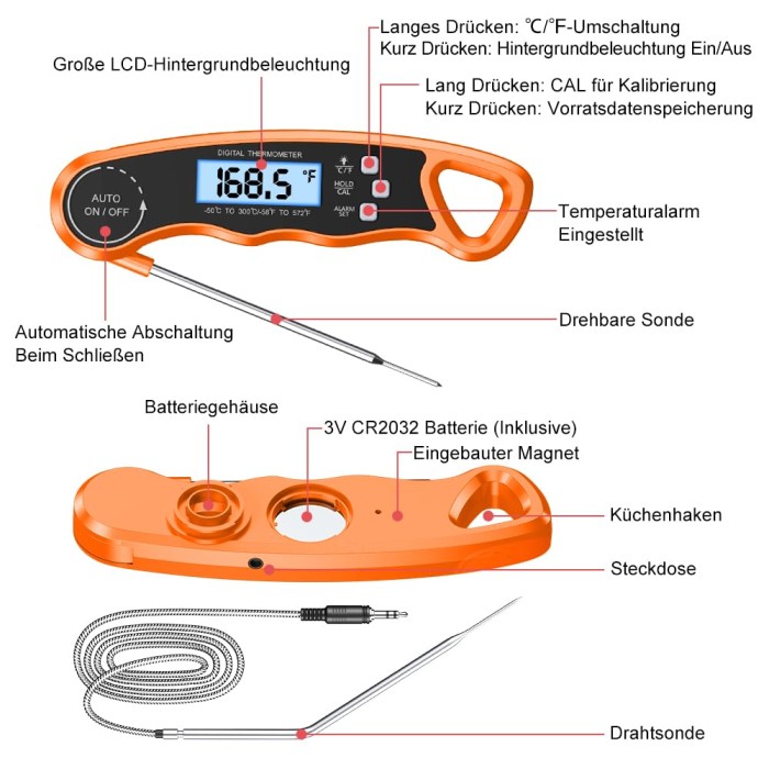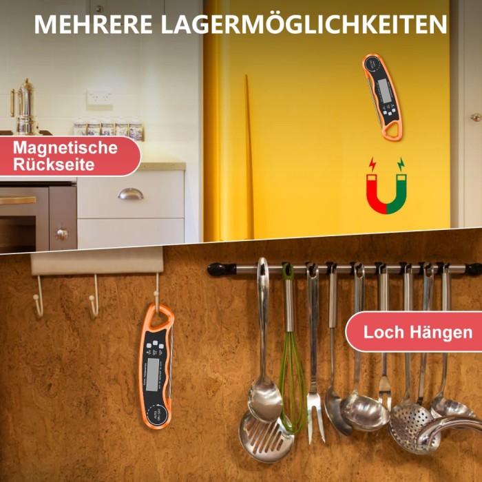 - [Benutzerfreundlich] Das Küchenthermometer mit faltbarer Sonde kann zur bequemeren Aufbewahrung einfach zusammengeklappt werden. Es verfügt über einen eingebauten Magneten und ein Aufhängeloch, sodass es einfach am Ofen oder Kühlschrank angebracht oder überall aufgehängt werden kann. Es verfügt über zwei interne CR 2032-Batterie und ein Fleischtemperaturdiagramm, mit dem Sie mühelos köstliche Gerichte zubereiten können.