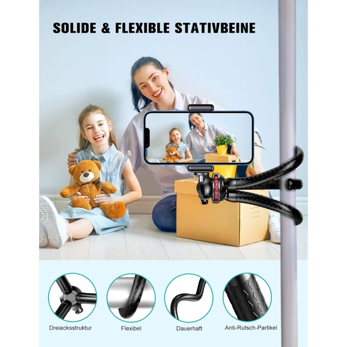 - 【Ultrastabiles Design】 Mit der verbesserten Smartphone-Halterung und der Feststellschraube ist das Handystativ stabil genug, um Ihr Smartphone/Ihre Kamera fest in der gewünschten Position zu halten. Das Design mit rutschfesten Gummifüßen hält das verstellbare Stativ sehr stabil, egal ob auf einem Schreibtisch oder auf dem Boden.
