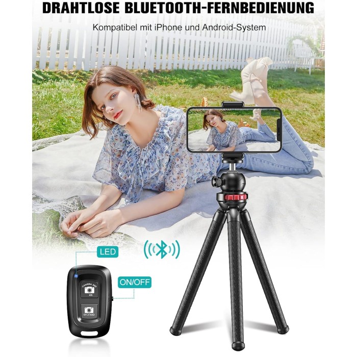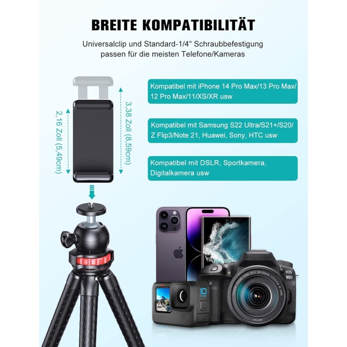 - 【Universelle Kompatibilität】 Dieses Kamera Stativ passt für Handys mit einer Breite von 2,16"-3,38" (5,49-8,59cm), kompatibel mit iPhone 17 Pro Max/17 Pro/17 Air/17/16 Pro Max/16 Plus/16 Pro/16/15 Pro Max/15 Pro/15 Plus/15/14/13/12/11/XS Max/XR/XS/X/SE/8 Plus/7, Galaxy S25 Ultra/S25+/S24/S23+/S22 Ultra/S21, Xiaomi etc. Eingebautes 1/4"-Gewinde für DSLR, Sportkamera usw. Das Mini Stativ kann auch als Tablet-Ständer oder Selfie-Stick verwendet werden.