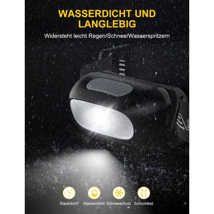 - [IPX4 Wasserdicht] - Die Stirnlampe LED besteht aus einem soliden ABS-Material und ist gemäß IPX4 wasserdicht, starker Regen oder Spritzwasser sind kein Problem mehr, wenn Sie diese Stirnlampe für Innen- oder Außenaktivitäten verwenden. Der beste Begleiter beim Hundespaziergang, beim Camping, beim Laufen, beim Wandern, beim Höhlenwandern, beim Bergsteigen oder auch für Notfälle zu Hause oder am Arbeitsplatz.