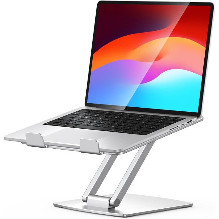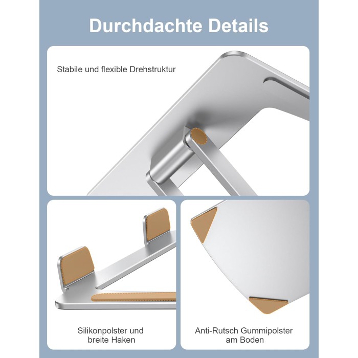 - 【Solide & Stabil】: Unser Laptop Stand zeichnet sich durch eine robuste Konstruktion aus dickem Aluminiumlegierung aus und bietet außergewöhnliche Stabilität und Langlebigkeit. Die große, schwere Basis bietet herausragende Unterstützung für Laptops mit einem Gewicht von bis zu 8,8 lbs (4kg). Das Panel ist mit Silikonpads ausgestattet, die Ihren Laptop vor Kratzern schützen, während die vier rutschfesten Silikonpads an der Unterseite den Ständer sicher an Ort und Stelle halten.
