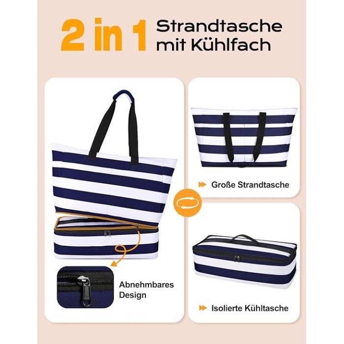 - 【Abnehmbare Kühltasche】 Unsere Badetasche Damen mit abnehmbarer Doppelreißverschluss-Design ermöglicht es, die Große Strandtasche und Kühltasche mühelos zu trennen. Die isolierte Kühltasche hält Getränke stundenlang kalt (mit Eisbeuteln verlängerbar), während das wasserdichte Innenfutter Austreten von Schmelzwasser verhindert. Zusätzlich ist sie vielseitig für nasse Badeanzüge oder Flip-Flops nutzbar – ideal für Strandabenteuer!