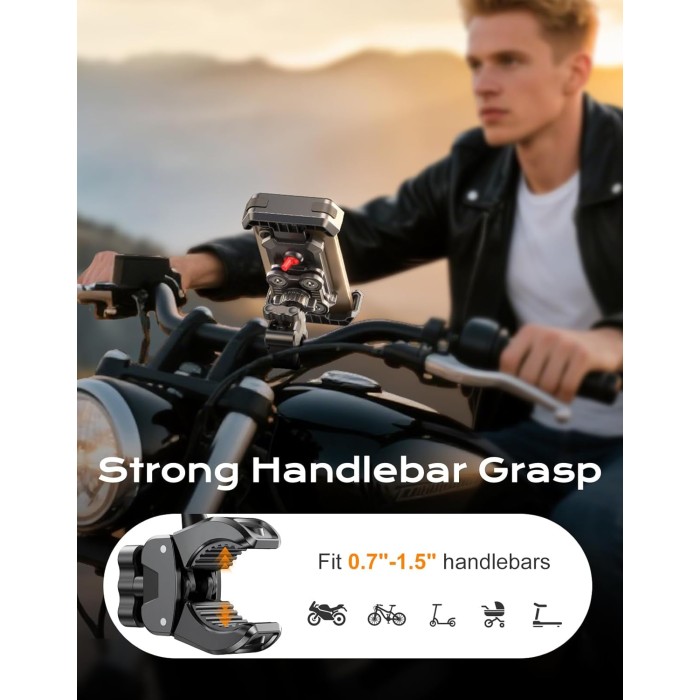 - [Einfache Installation] Die innovative Klemme ermöglicht eine problemlose Montage ohne Werkzeug. Mit nur einer Mutter erreichen Sie bombenfesten Halt und sind in weniger als 30 Sekunden fahrbereit! Unsere vielseitige Handyhalter Motorrad ist für Lenkerdurchmesser von 18–39mm geeignet und lässt sich mühelos an Motorrädern, Fahrrädern, Rollern, E-Bikes, Kinderwagen und sogar Fitnessgeräten wie Laufbändern und Heimtrainern befestigen.