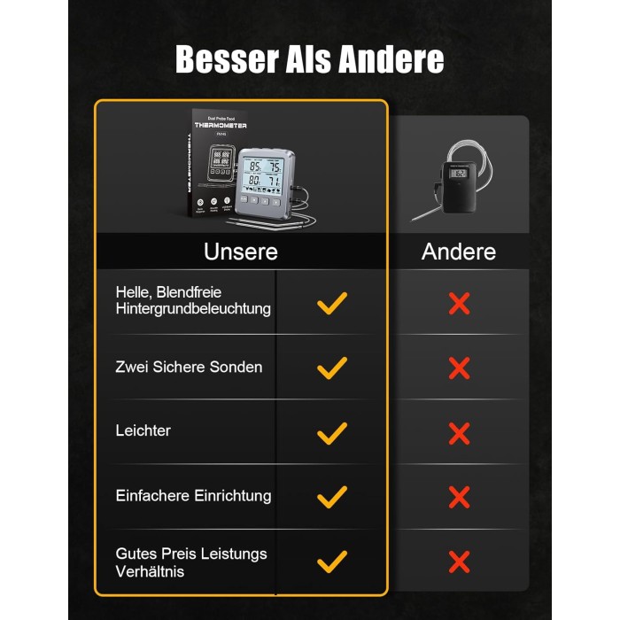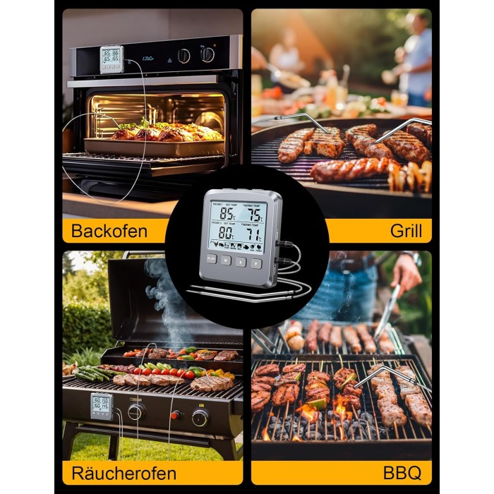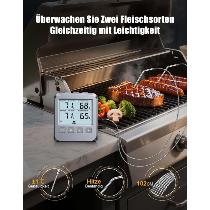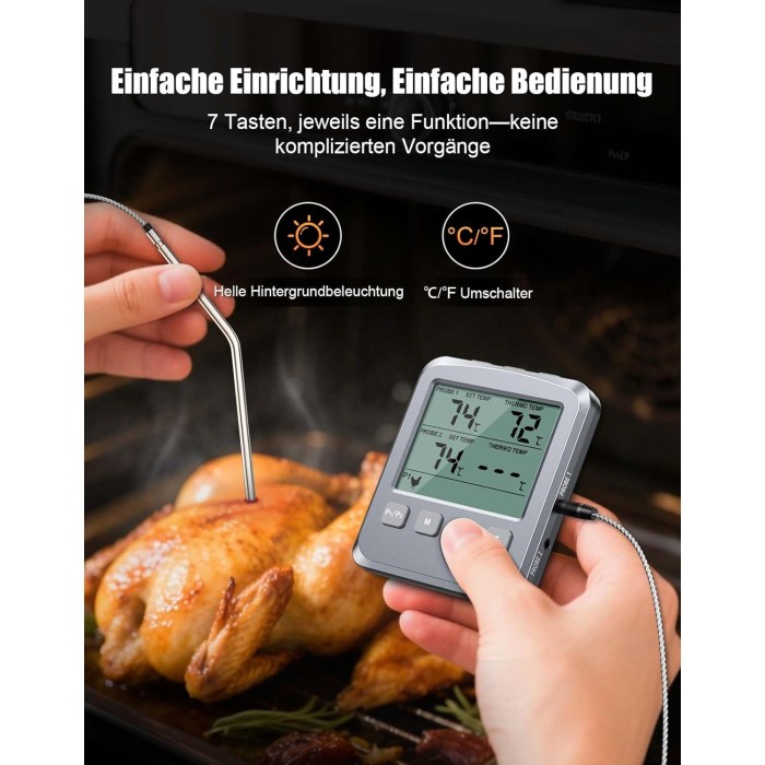 - 【Vielseitig Einsetzbar】 Unser Bratenthermometer liefert präzise Messwerte für Fleisch, Flüssigkeiten, Braten und Backen – entwickelt für den Einsatz in Backöfen, Grills, BBQs, Räucheröfen, Grillplatten, Heißluftfritteusen und allen Innen- und Außenküchen. Die voreingestellten Temperaturen vereinfachen die Zubereitung von Hähnchen, Rind, Lamm, Schwein, Pute und Fisch.