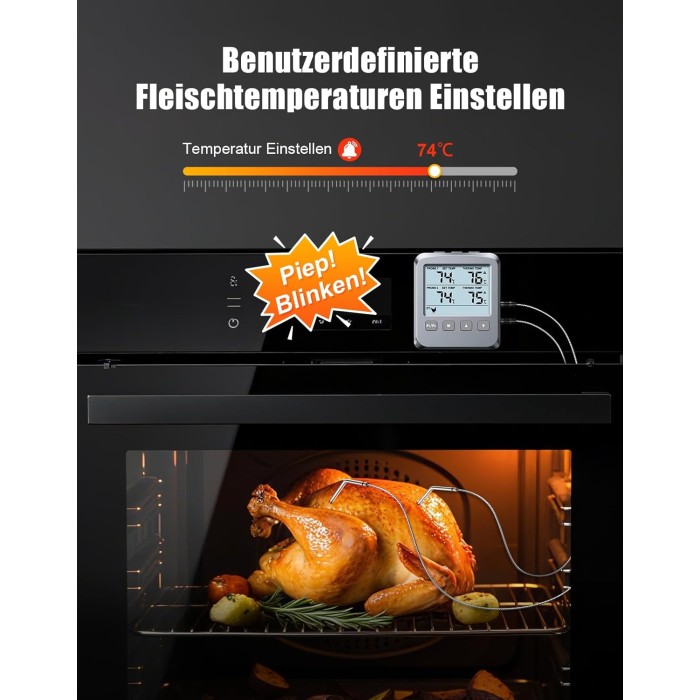 - 【8 Voreingestellte Temperaturen & Alarme】 Mit 8 vorprogrammierten Grillthermometer und anpassbaren Alarmen ermöglicht dieses Backofenthermometer präzises Garen mit dreifacher Alarmmeldung (hörbarer Piepton, blinkende Hintergrundbeleuchtung und Display), sobald die Zieltemperatur erreicht ist.